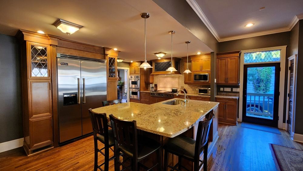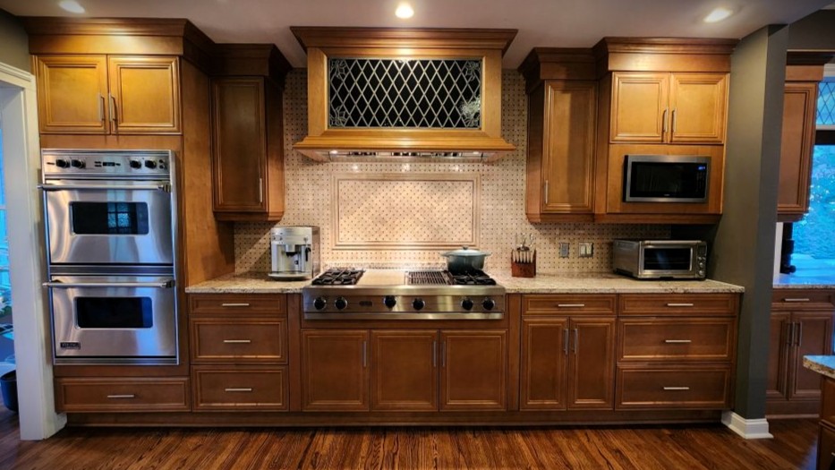 - Beautiful leaded glass cabinets and range hood and door transoms
